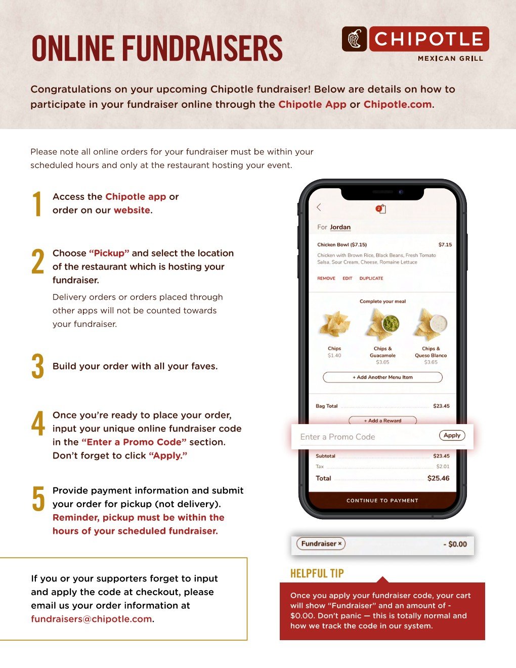 Back to All Events Chipotle Spirit Night Wednesday, February 11, 2026 4:00 PM 8:00 PM Chipotle 8250 Mira Mesa Boulevard San Diego, CA, 92126 United States (map) Google Calendar ICS Fundraiser Code for Online Ordering: ATN32MYPlease note that fundraiser online ordering is only valid for pickup during your fundraiser’s scheduled date, time, and assigned restaurant. Ordering delivery for fundraisers is not permitted at this time.